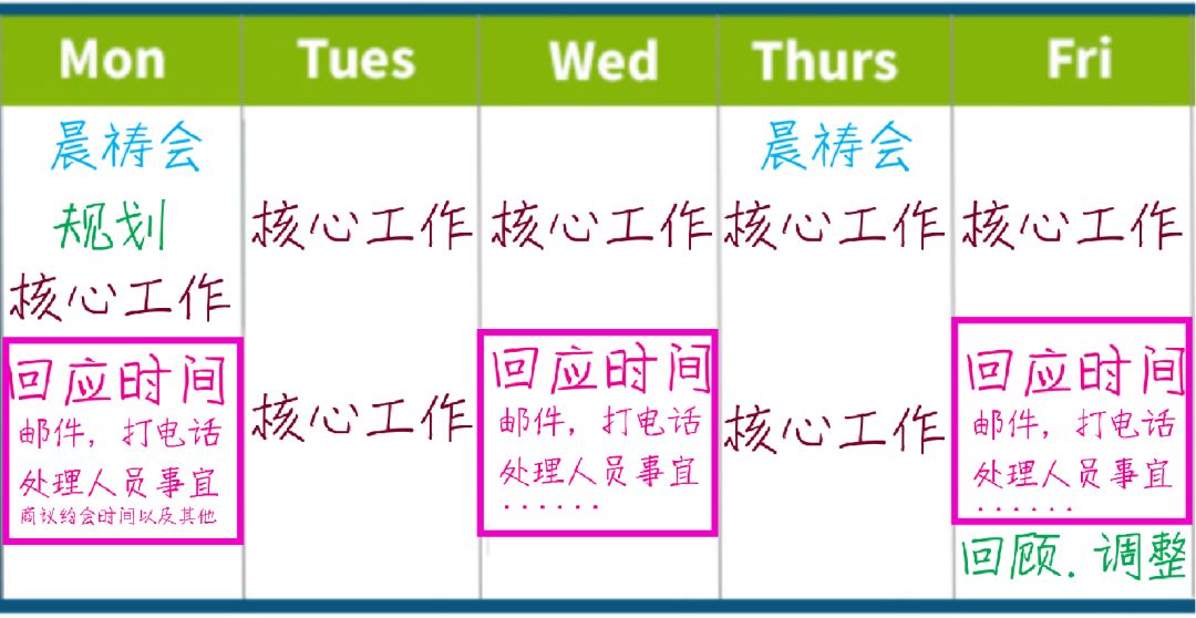 在我的时间表里,我每周拨出三个下午的高效时间来对教堂的工作人员做出回应,特别是我的领导团队。这段时间我处理和操作电子邮件,打电话,处理与工作人员相关的事宜,商议约会时间,以及其他任何需要我涉及的事情。知道我还有预留的时间来处理琐事是件很愉快的事,这样回应时间就不会侵占我的成效时间。