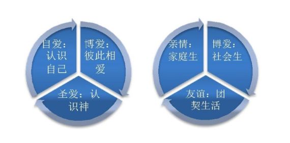 使徒约翰告诉我们,“凡有爱心的,都是由神而生,并且认识神。没有爱心的,就不认识神。” (约壹四7-8)如图所示,综上所述,我们可以看到团契生活所凝聚的认识神与认识人自己和彼此相爱之间的相互镶嵌与互动关系,即神、人自己及其与他人之间“你中有我,我中有你”的互融与内住关系。而有这样美好团契生活与人神彼此内住关系的信徒,也会在其所处的家庭与社会中活出属神生命的智能与力量,见证神给这个世代的希望与引领。