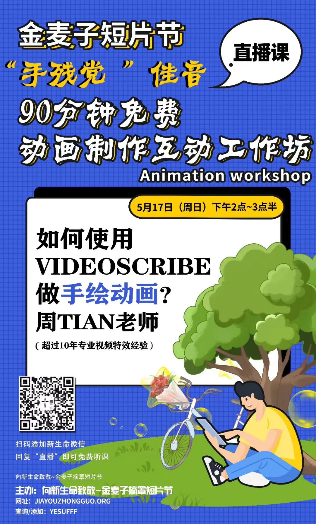在疫情阴霾下,为了给大家加油,新生命公众号发起来了《金麦子短片节》,邀请主内外热爱生命的朋友,用15-30秒视频,分享摘下口罩的喜悦,参加者们能获得参与奖、各样金麦子大奖,并举办一系列视频制作、儿童教育、心理健康的工作坊,热烈邀请大家参加!